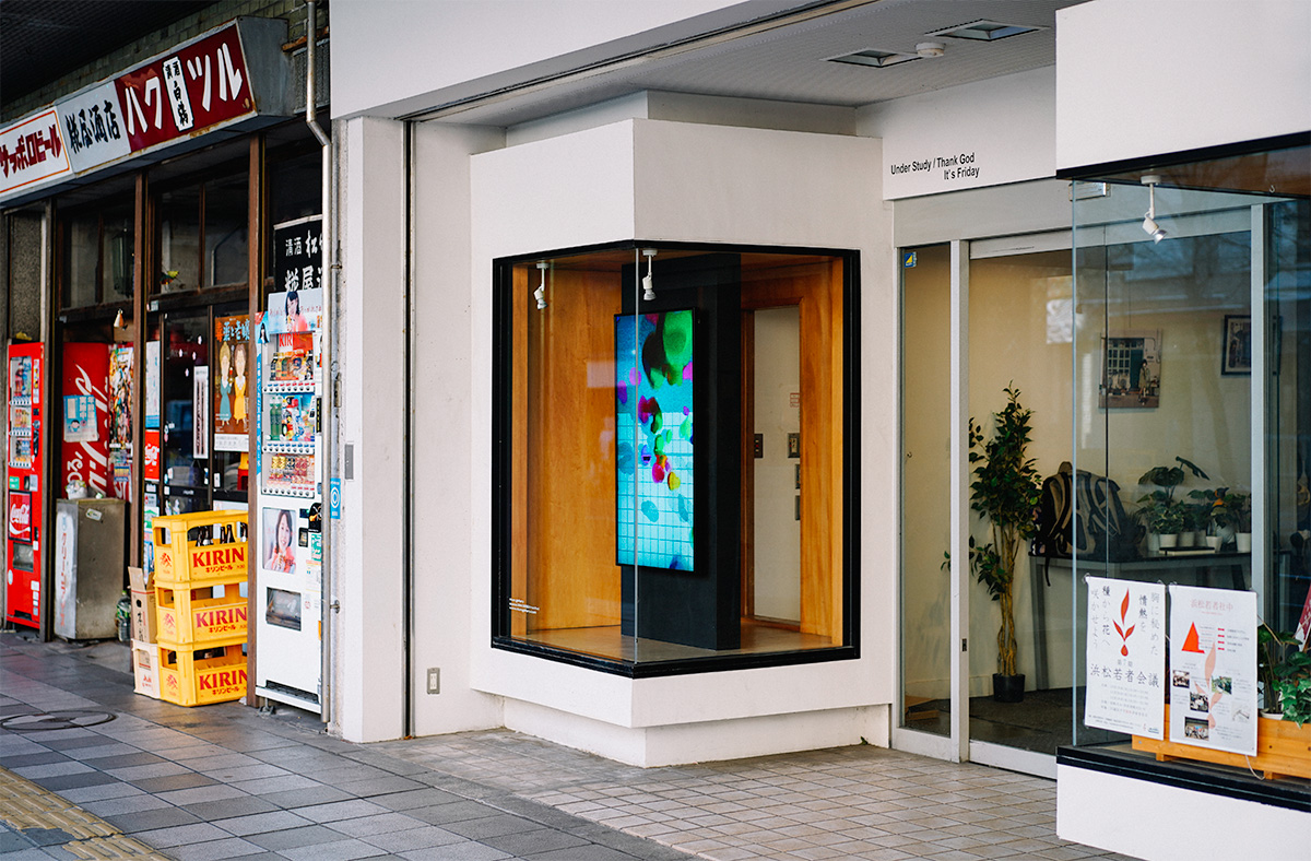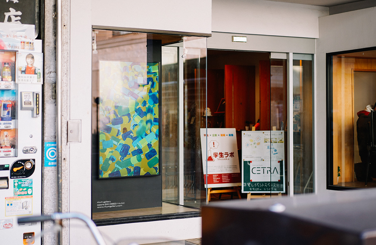 nium galleryは、静岡県浜松市の中心市街地にある、ショーウィンドウの中に設置した一枚のモニターだけで完結する極小のデジタルアート・ギャラリーです。「まちにオープン」「誰にでもオープン」「24時間オープン」という3つのオープン性を備え、公共空間に開かれた、その前を通る人なら誰でも、いつでも気軽に作品に触れることのできるギャラリーを標榜しています。